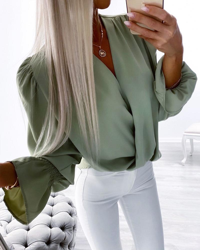 Style:Chic Type:Blouses Material:Polyester Neckline:V-Neck Sleeve Style:Long Sleeve Length:Regular Pattern Type:Plain Decoration:Ruched Fit Type:Regular Occasion:Daily Package Include:1* Blouse Fabric Elasticity:Slight Stretch Sleeve Type:Lantern Sleeve Sheer:No Care Instructions:Machine wash or professional dry clean