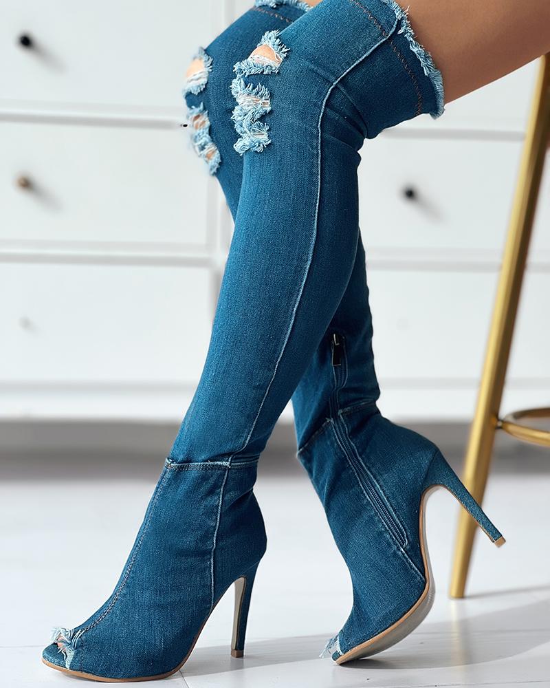 Style:Chic,Denim Type:Boots Material:Denim Pattern Type:Contrast Paneled Decoration:Fringe,Ripped Occasion:Daily Toe:Peep Toe Heel Height:High Heel Package Include:1*Boots