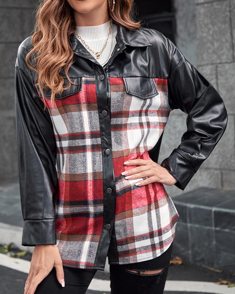 Plaid Print Buttoned PU Leather Patchwork Jacket