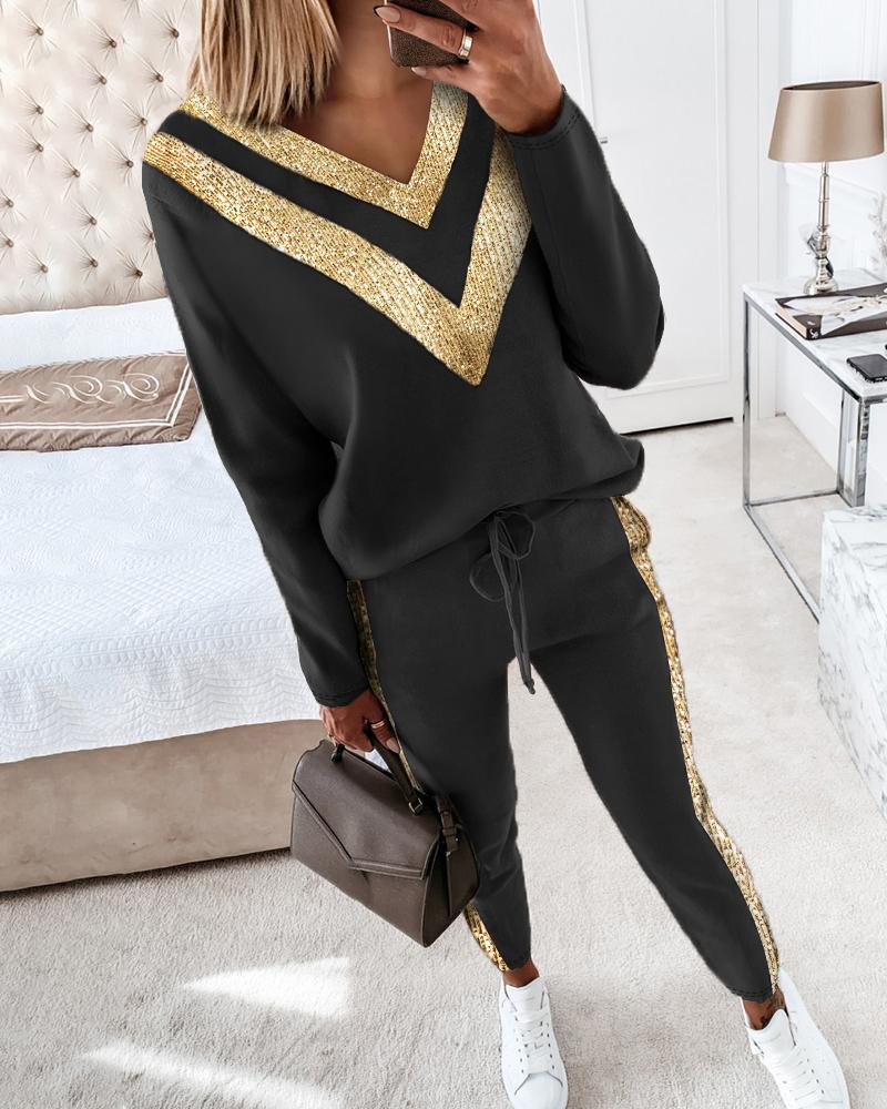 Style:Chic,Casual Type:Sweatpants Sets,Sweatshirt Sets,Pants Sets Material:95%Polyester,5%Elastane Neckline:V-Neck Sleeve Style:Long Sleeve Length:Long Pattern Type:Chevron Decoration:Contrast Sequin Fit Type:Regular Occasion:Daily Package Include:Pants Set