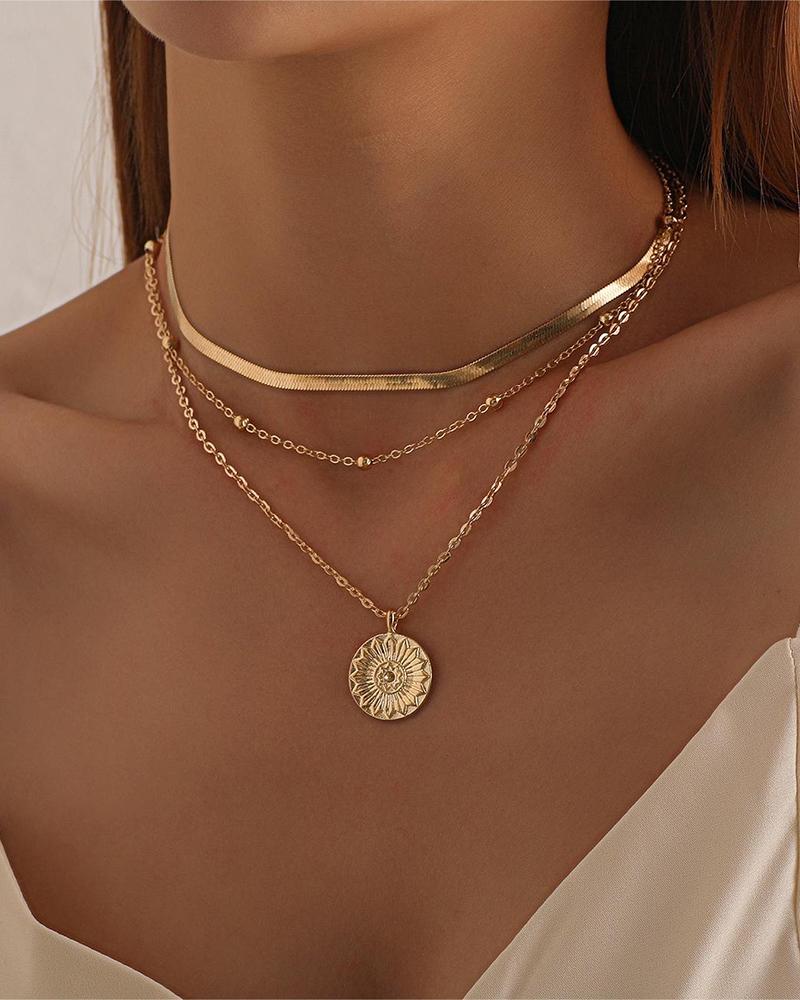 1pcs Multi-Layered Beaded Herringbone Floral Embossed Pendant Necklace
