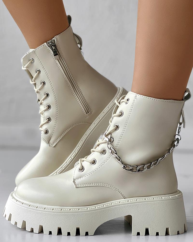 Zipper Design Chain Decor Lace-up Platform Ankle Boots