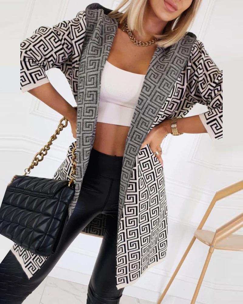 Geometric Print Long Sleeve Hooded Knit Cardigan