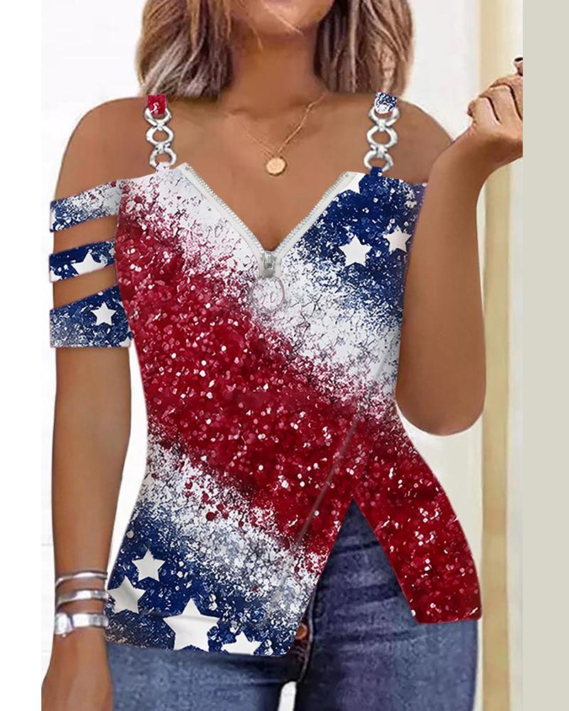 Style:Casual Type:Tee Material:97%Polyester,3%Spandex Neckline:Cold Shoulder Sleeve Style:Short Sleeve Length:Regular Pattern Type:Flag,Ombre Decoration:Cutout,Zipper Fit Type:Regular Occasion:Daily Package Include:1*T-Shirt Fabric Elasticity:Non-Stretch Sheer:No Care Instructions:Machine wash or professional dry clean
