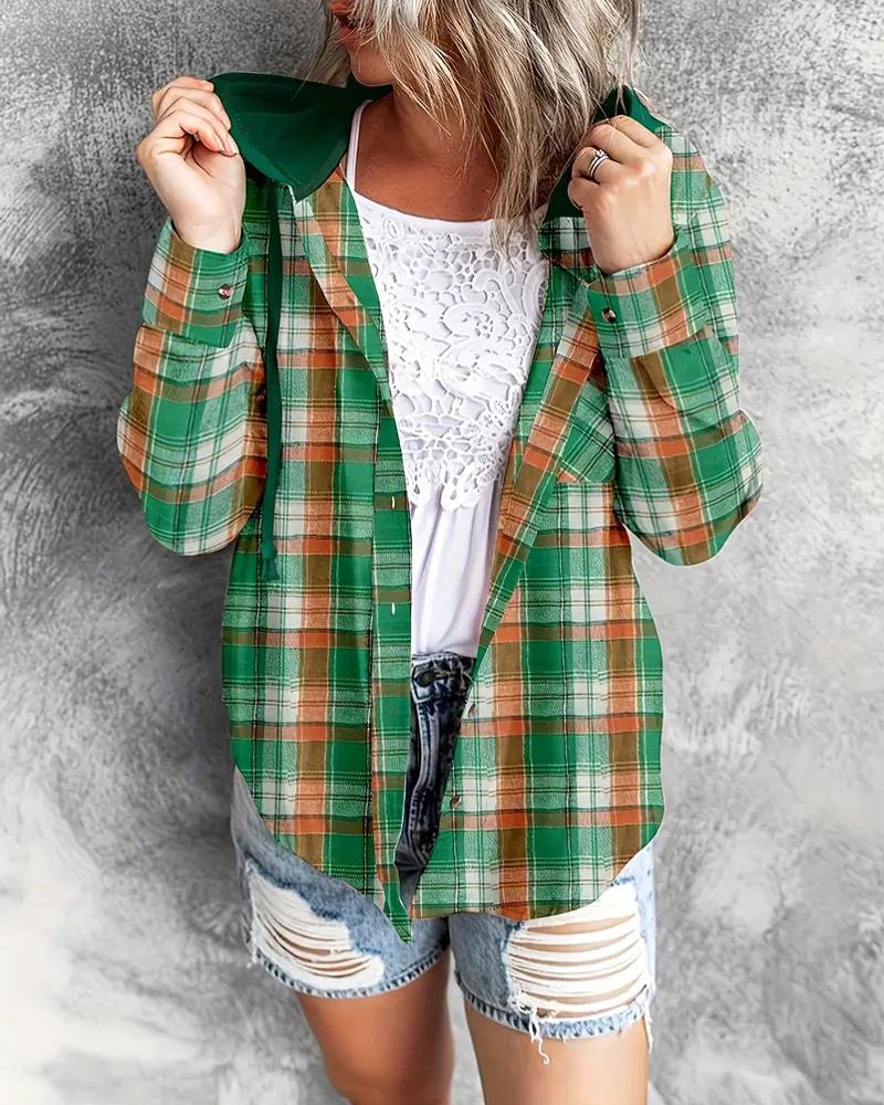 Plaid Print Buttoned Hooded Top
