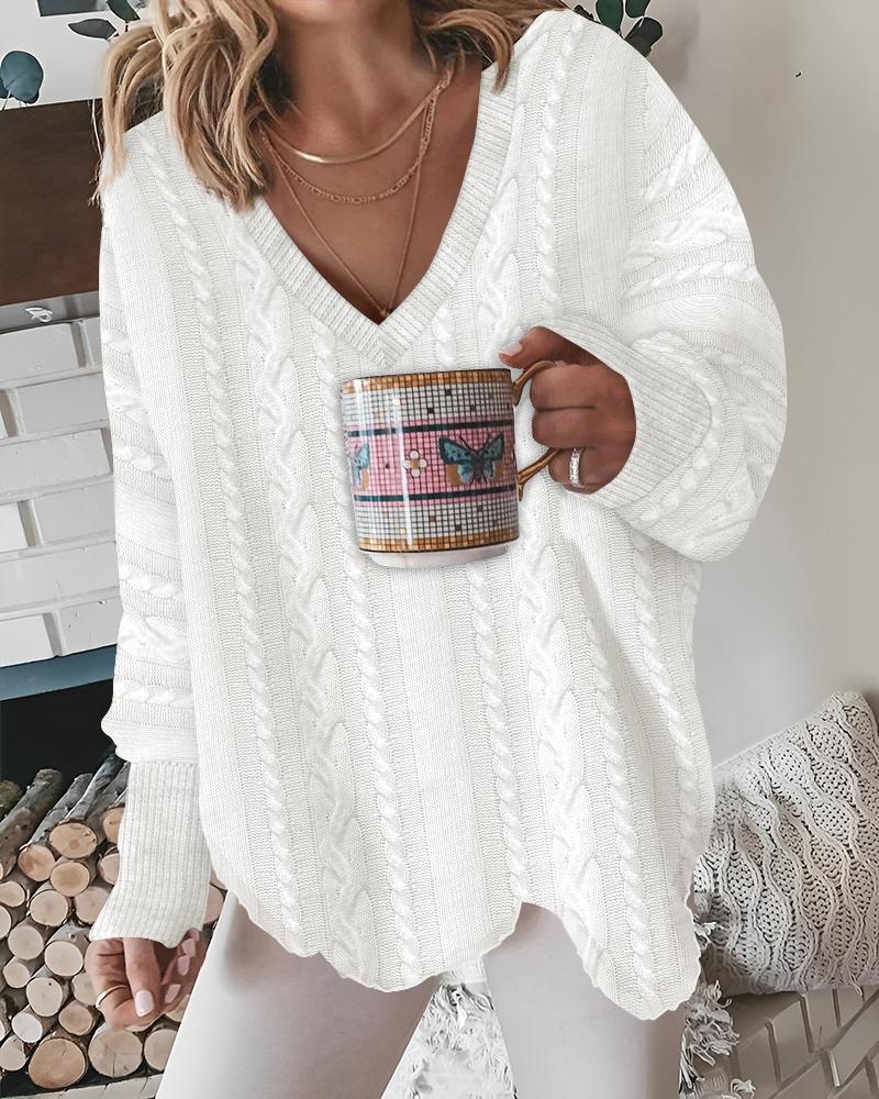 V-Neck Asymmetrical Braided Knit Sweater