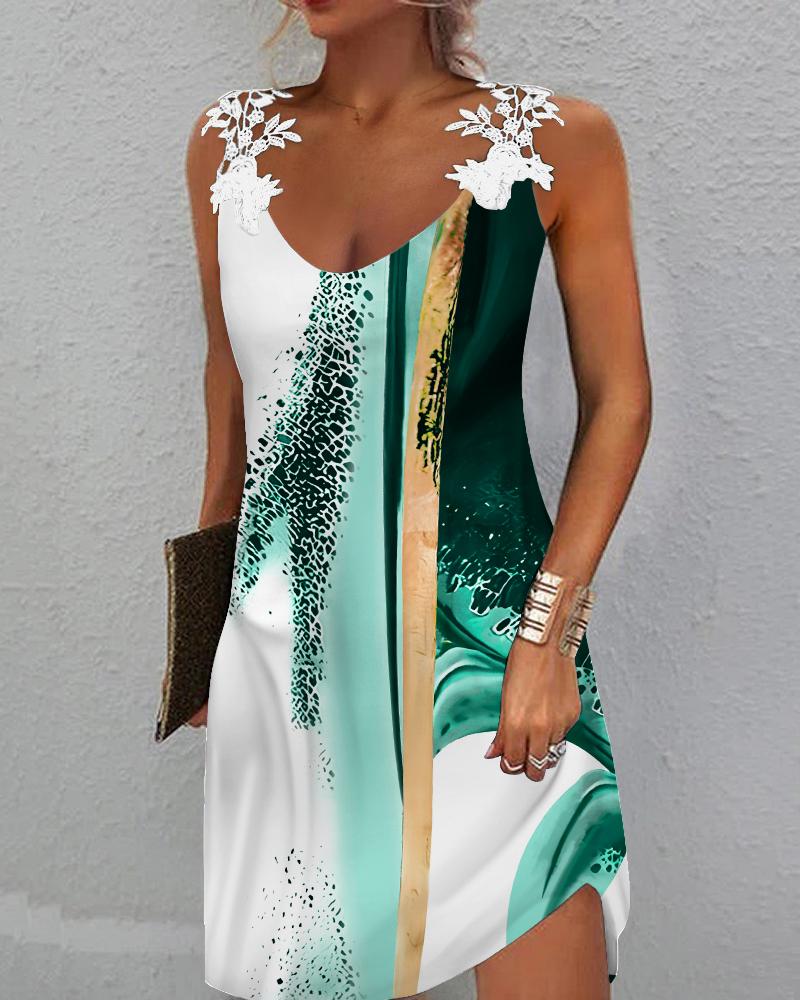 Style:Casual Type:Straight Material:95%Polyester,5%Elastane Neckline:V-Neck Sleeve Style:Sleeveless Length:Mini Pattern Type:Tie Dye Decoration:Contrast Lace Fit Type:Regular Occasion:Daily,Vacation Package Include:1* Dress Fabric Elasticity:Slight Stretch Sheer:No Care Instructions:Machine wash or professional dry clean