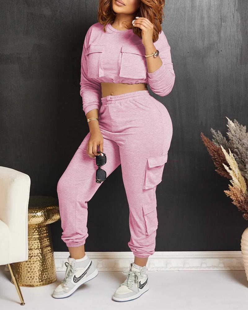 Pocket Design Crop Sweatshirt & Cuffed Sweatpants Set