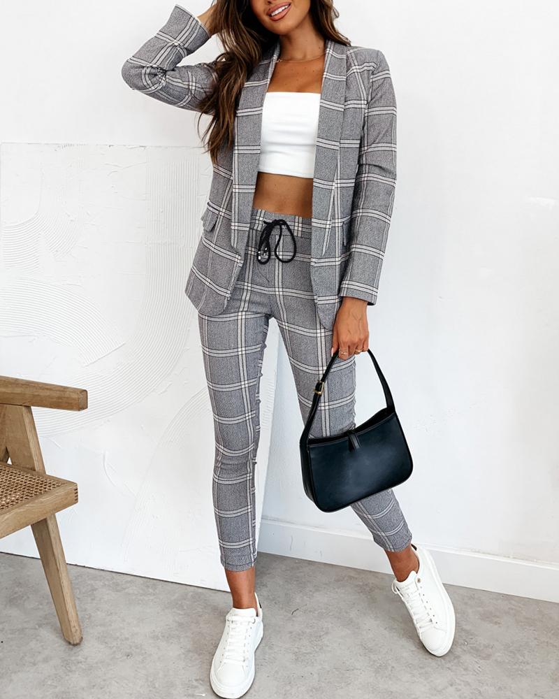 Plaid Print Pocket Design Blazer Sets Without Belt