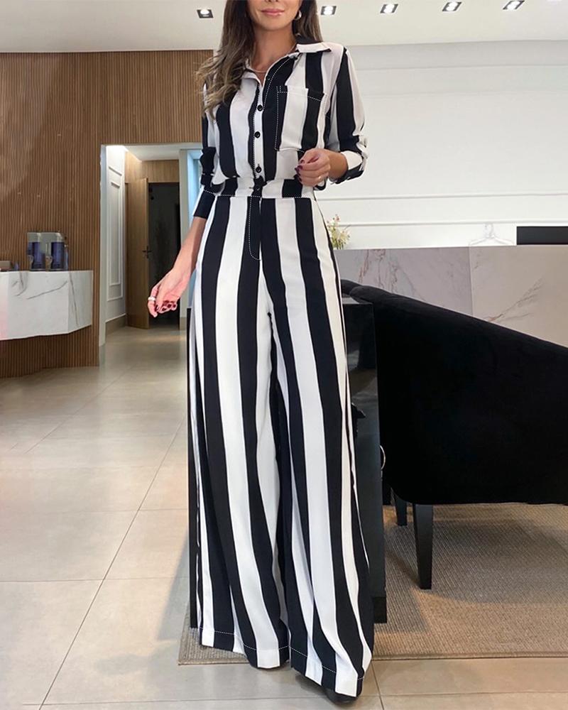 Style:Chic,Elegant Type:Pants Sets Material:95%Polyester,5%Elastane Neckline:Turn-down Collar Sleeve Style:Long Sleeve Length:Long Pattern Type:Striped Decoration:Button,Pocket Fit Type:Regular Occasion:Daily,Work Package Include:1*Pants Set Fabric Elasticity:Slight Stretch Sheer:No Care Instructions:Machine wash or professional dry clean