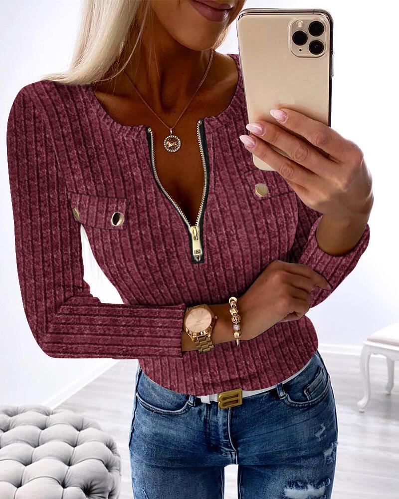 Style:Chic Type:Ribbed Top Material:95%Polyester,5%Elastane Neckline:Round Neck Sleeve Style:Long Sleeve Length:Regular Pattern Type:Plain Decoration:Button,Zipper Fit Type:Skinny Occasion:Daily Package Include:1*Top Fabric Elasticity:Slight Stretch Sheer:No Care Instructions:Machine wash or professional dry clean