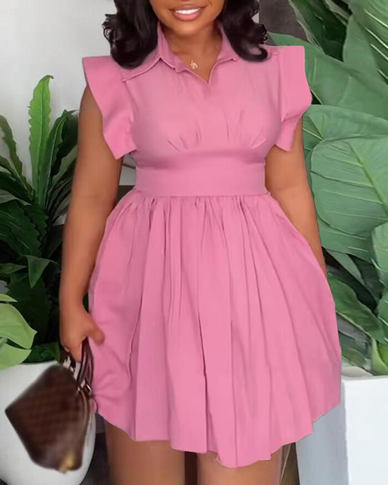 Style:Casual Type:Pleated Material:97%Polyester,3%Elastane Neckline:Turn-down Collar Sleeve Style:Short Sleeve Length:Midi Pattern Type:Plain Decoration:Ruched Fit Type:Regular Occasion:Daily Package Include:1* Dress Fabric Elasticity:High Stretch Sleeve Type:Flutter Sleeve Sheer:No Care Instructions:Machine wash or professional dry clean