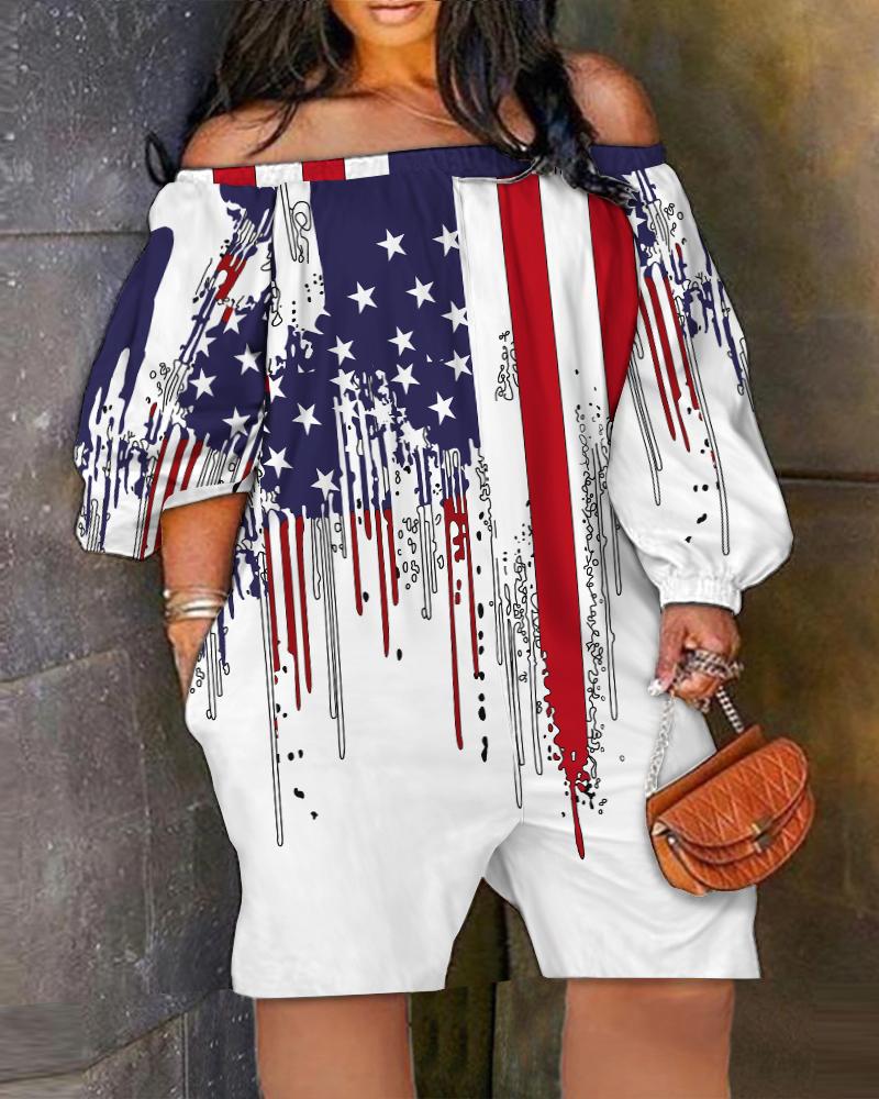 Plus Size Independence Day Flag Print Off Shoulder Romper