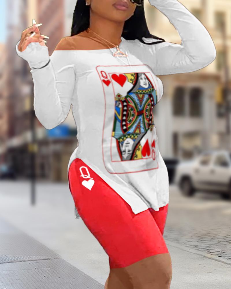 Plus Size Poker Card Print Skew Neck Slit Top & Shorts Set