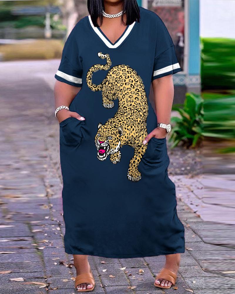 Style:Casual Type:Straight Material:97%Polyester,3%Spandex Neckline:V-Neck Sleeve Style:Short Sleeve Length:Maxi Pattern Type:Leopard,Contrast Paneled Decoration:Pocket Fit Type:Regular Occasion:Daily Package Include:1* Dress