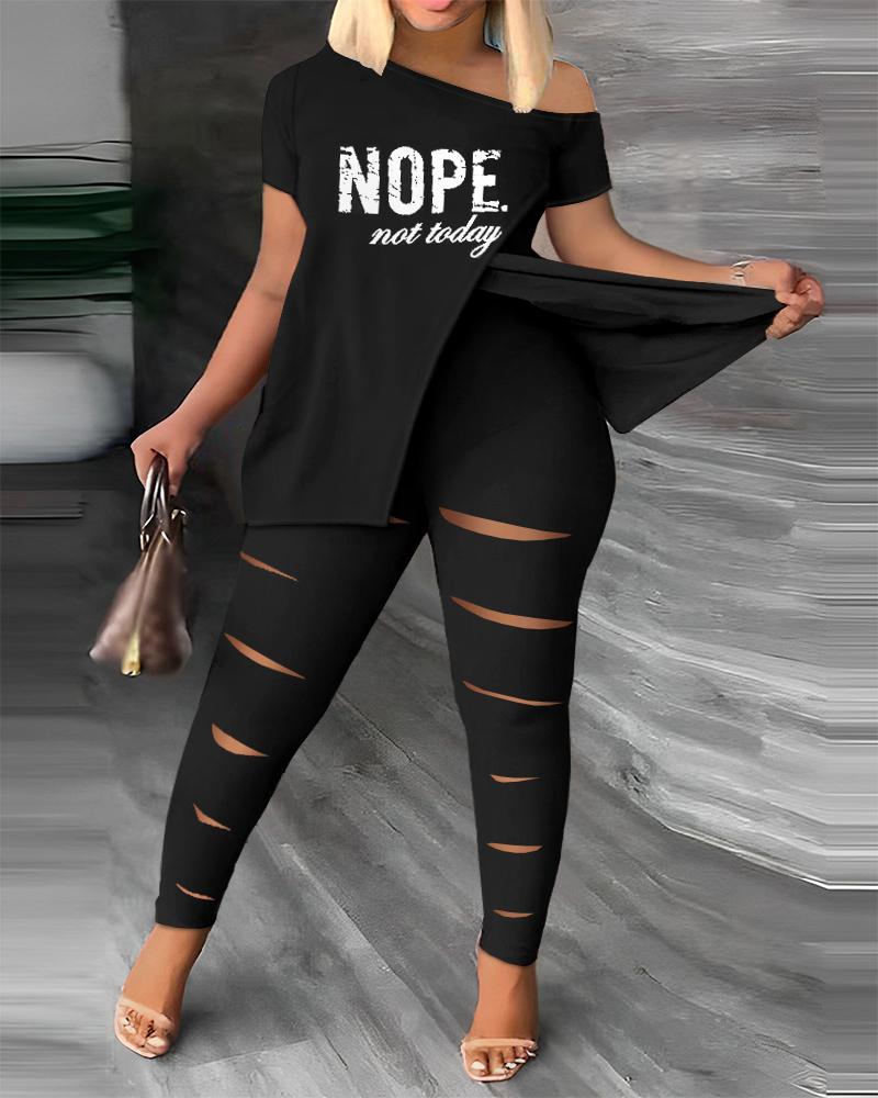Plus Size Nope Not Today Print Split Hem Top & Ladder Cutout Pants Set