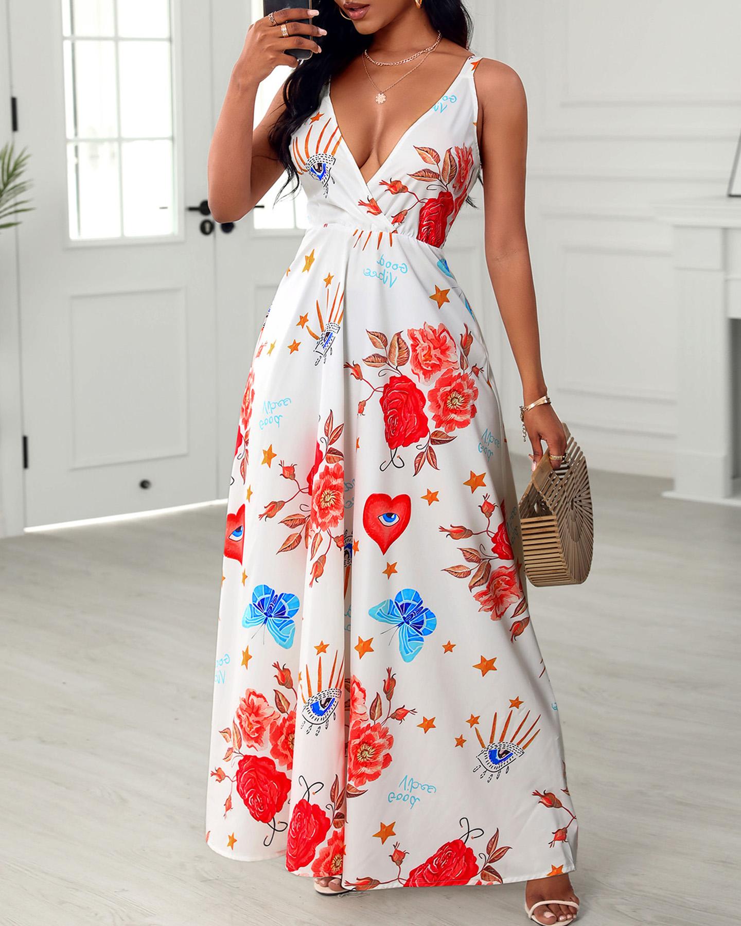 Style:Sexy Type:Flared Material:Polyester Neckline:Plunge Sleeve Style:Sleeveless Length:Maxi Pattern Type:All Over Print Fit Type:Regular Occasion:Vacation Package Include:1* Dress