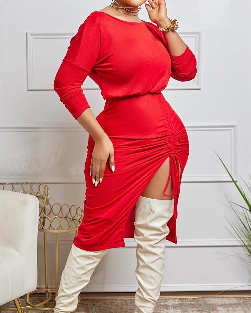 Style:Chic Type:Slit Material:100%Polyester Neckline:Round Neck Sleeve Style:Long Sleeve Length:Asymmetrical Pattern Type:Plain Decoration:Drawstring,Ruched Fit Type:Regular Occasion:Daily Package Include:1* Dress Fabric Elasticity:Slight Stretch Sheer:No Care Instructions:Machine wash or professional dry clean
