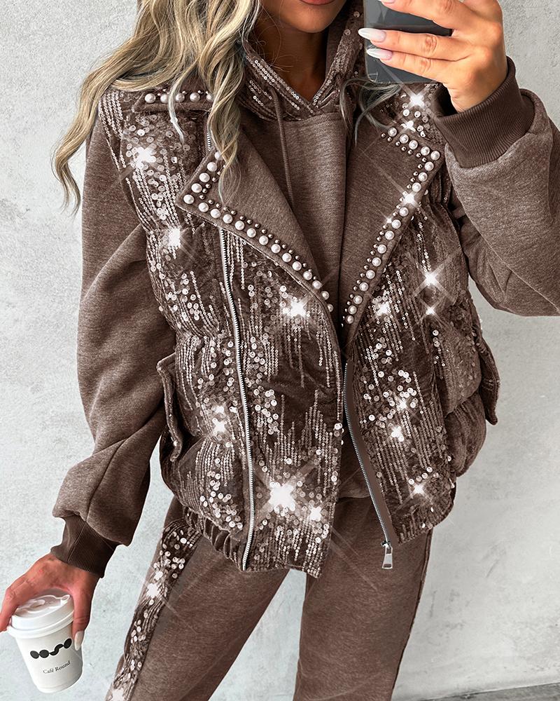 Contrast Sequin Pearls Decor Vest Puffer Coat