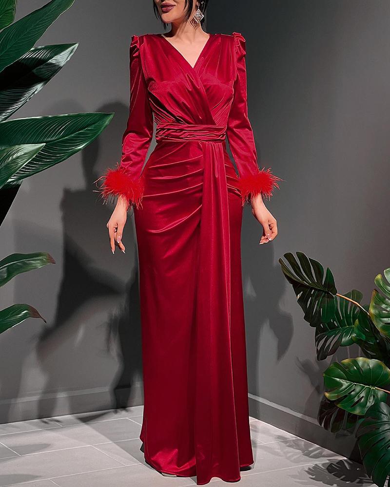 Style:Chic Type:Straight Material:100%Polyester Neckline:V-Neck Sleeve Style:Long Sleeve Length:Maxi Pattern Type:Plain Decoration:Ruched,Feather Fit Type:Regular Occasion:Evening Package Include:1* Dress Fabric Elasticity:Slight Stretch