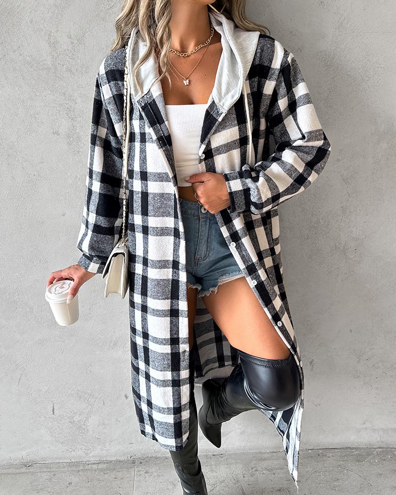 Plaid Print Buttoned Drawstring Hooded Longline Shacket