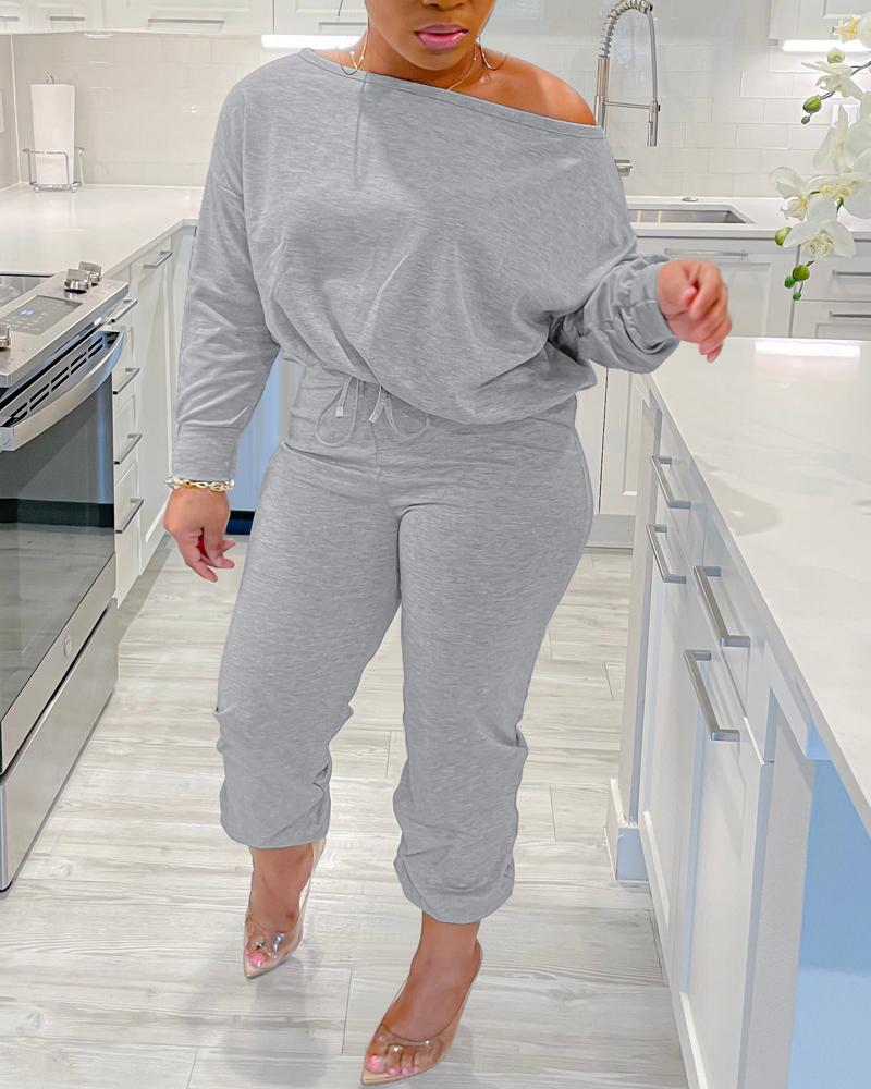 Style:Casual Type:Pants Sets Material:95%Polyester,5%Elastane Neckline:Skew Neck Sleeve Style:Long Sleeve Length:Long Pattern Type:Plain Decoration:Drawstring Fit Type:Regular Occasion:Daily Package Include:1*Pants Set Fabric Elasticity:Medium Stretch Sheer:No Care Instructions:Machine wash or professional dry clean