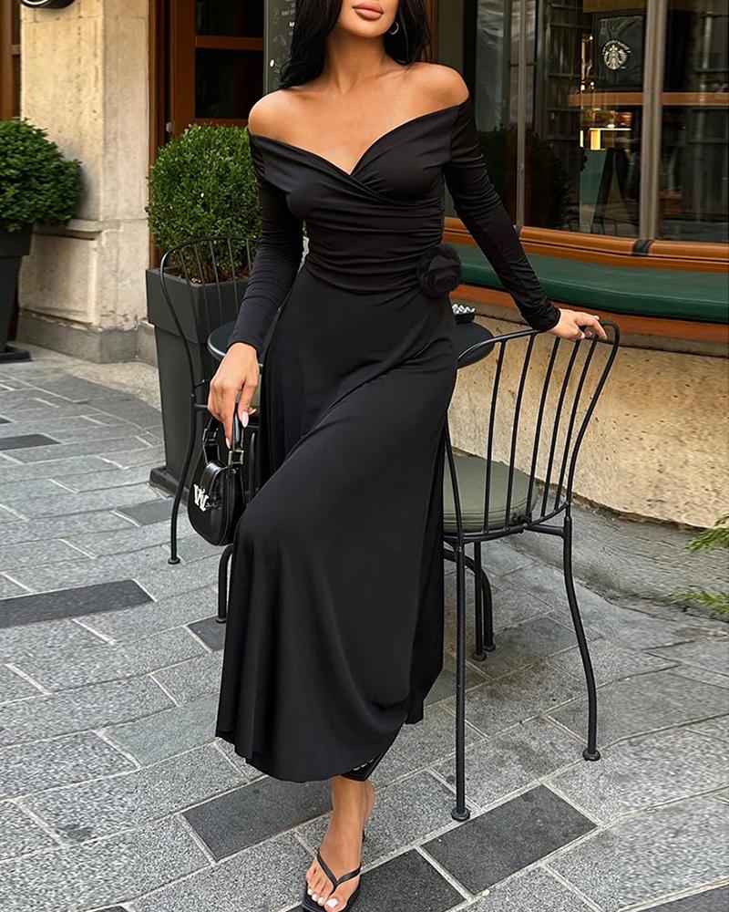 Style:Chic Type:A Line Material:100%Polyester Neckline:Off the Shoulder Sleeve Style:Long Sleeve Length:Mid-Calf Pattern Type:Plain Decoration:Ruched Fit Type:Regular Occasion:Party Package Include:1* Dress Fabric Elasticity:Slight Stretch Sheer:No Care Instructions:Machine wash or professional dry clean