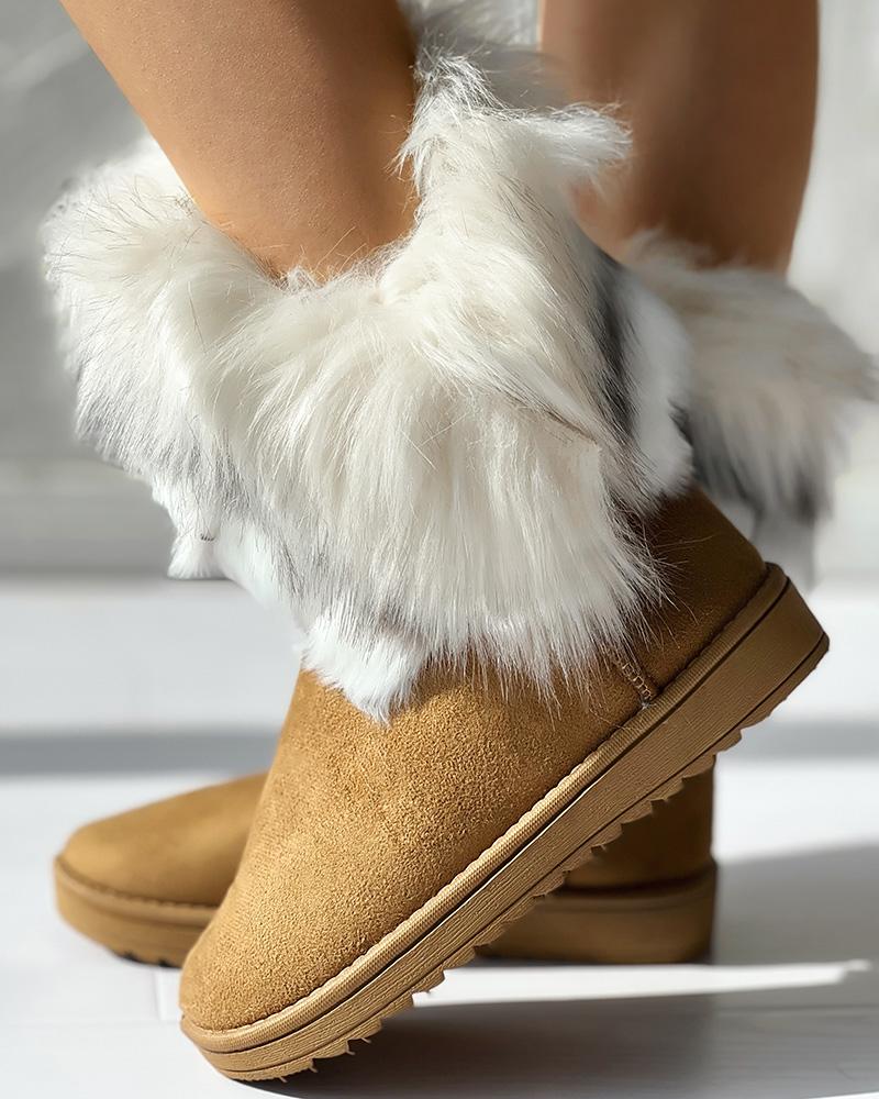 Style:Chic Type:Boots Material:Suede Pattern Type:Contrast Paneled Occasion:Daily Toe:Round Toe Heel Height:Flat Package Include:1*Boots
