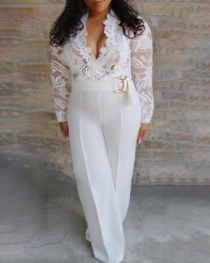 Style:Chic,Elegant Type:Jumpsuit Material:95%Polyester,5%Elastane Neckline:Plunge Sleeve Style:Long Sleeve Length:Long Pattern Type:Plain Decoration:Contrast Lace Fit Type:Regular Occasion:Daily,Work Package Include:1*Jumpsuit Fabric Elasticity:Medium Stretch Sheer:Semi-Sheer Care Instructions:Hand wash, do not dry clean