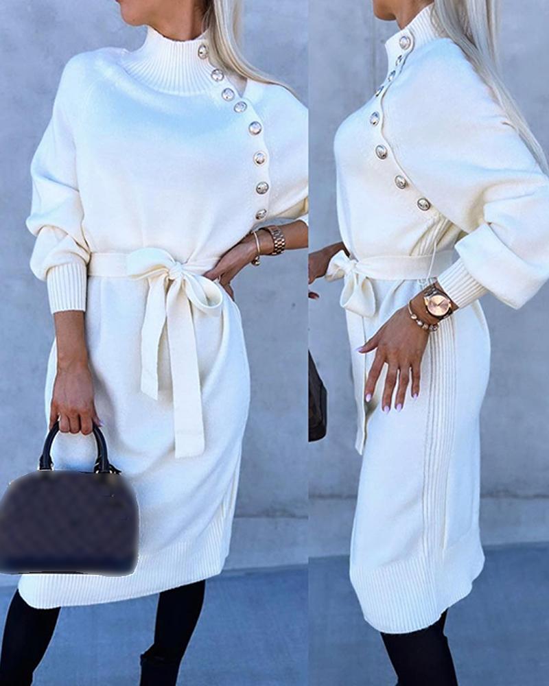 Style:Chic Type:Straight Material:97%Polyester,3%Elastane Neckline:High Neck Sleeve Style:Long Sleeve Length:Midi Pattern Type:Plain Decoration:Button,Tied Detail Fit Type:Regular Occasion:Daily Package Include:1*Dress Fabric Elasticity:Slight Stretch Sheer:No Care Instructions:Hand wash or dry clean
