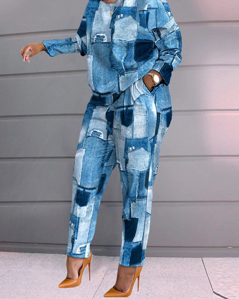 Plus Size Denim Look Print Long Sleeve Top & Pants Set