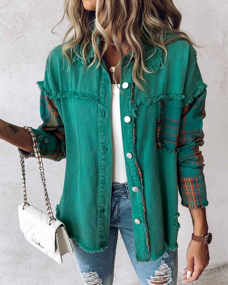 Style:Chic Type:Shacket Material:100%Polyester Neckline:Turn-down Collar Sleeve Style:Long Sleeve Length:Regular Pattern Type:Colorblock,Plaid Decoration:Button,Pocket,Raw Hem Fit Type:Regular Occasion:Daily Package Include:1*Shacket Fabric Elasticity:Slight Stretch