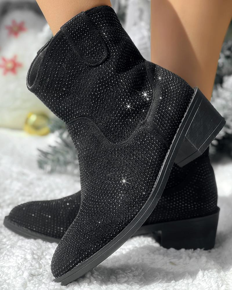 Rhinestone Decor Chunky Heel Ankle Boots