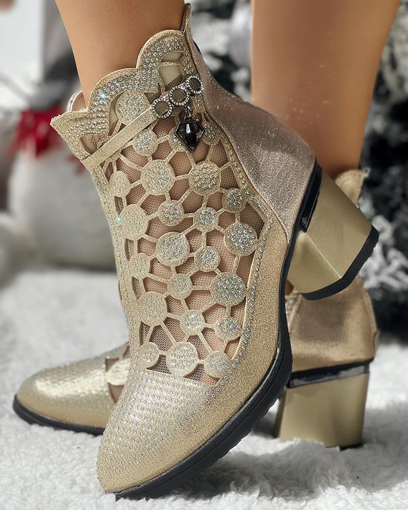 Rhinestone Hollow Out Breathable Chunky Heel Ankle Boots