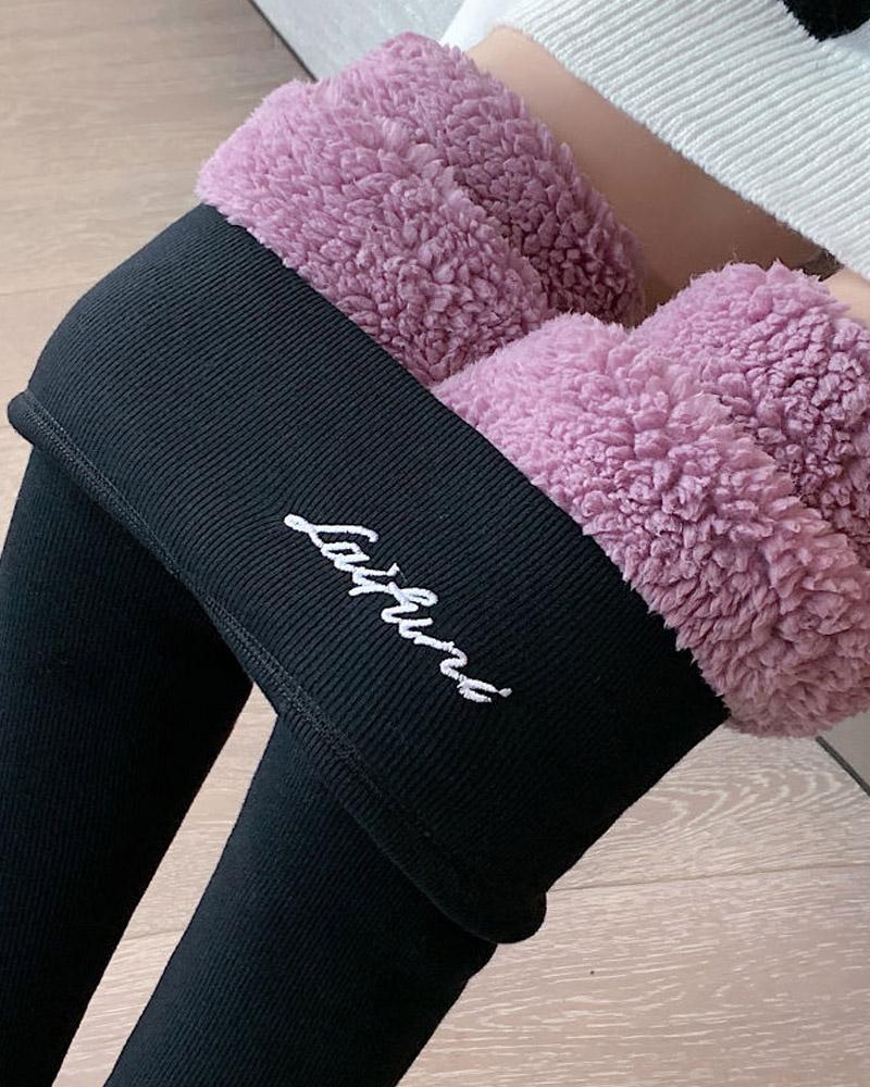 Letter Embroidery High Waist Thermal Warm Fleece Lined Leggings