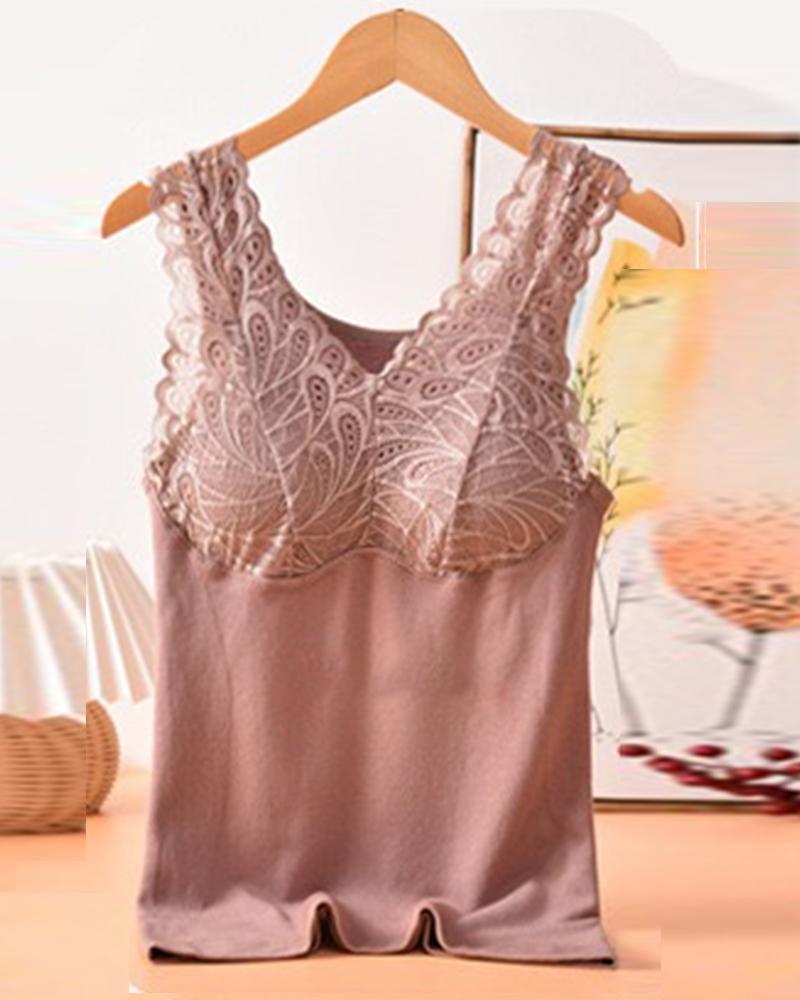 Sleeveless Lace Trim Padded Fleece Lined Underwear Thermal Tank Top