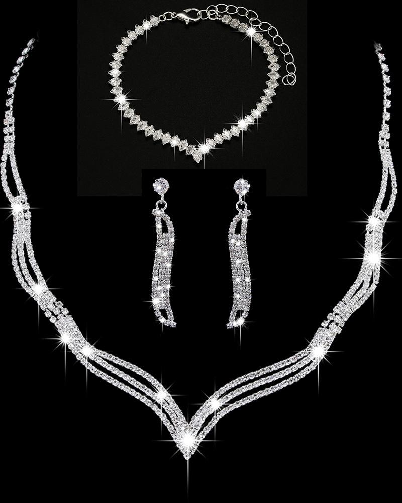 3PCS Rhinestone Hollow Out Chain Necklace & Drop Earrings & Bracelet Evening Party Wedding Jewelry Set
