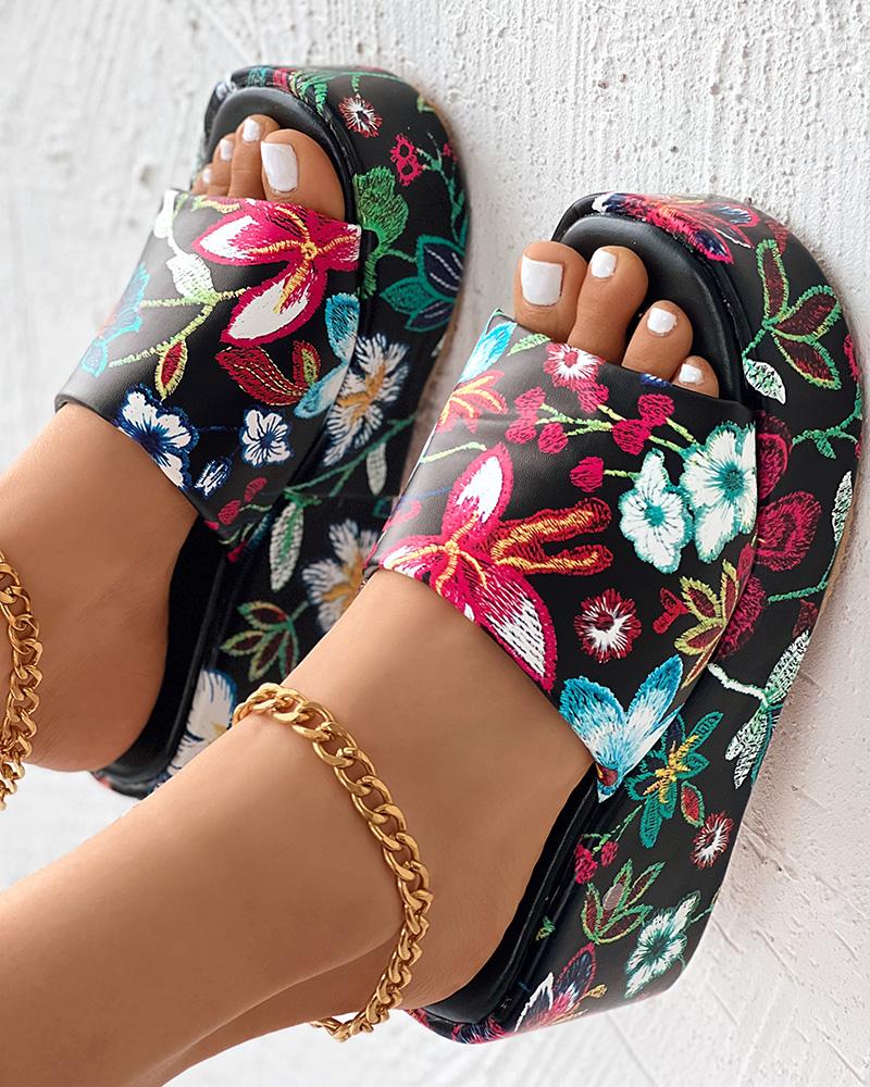 Floral Embroidery Wide Strap Wedge Slippers