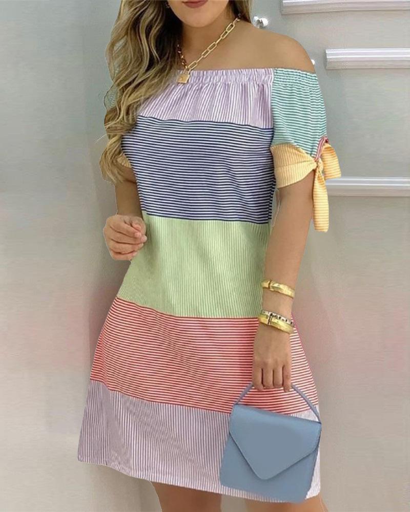 Style:Casual,Chic Type:A Line Material:Polyester Neckline:Off the Shoulder Sleeve Style:Short Sleeve Length:Mini Pattern Type:Colorblock,Striped Decoration:Tied Detail,Zipper Fit Type:Regular Occasion:Daily Package Include:1* Dress
