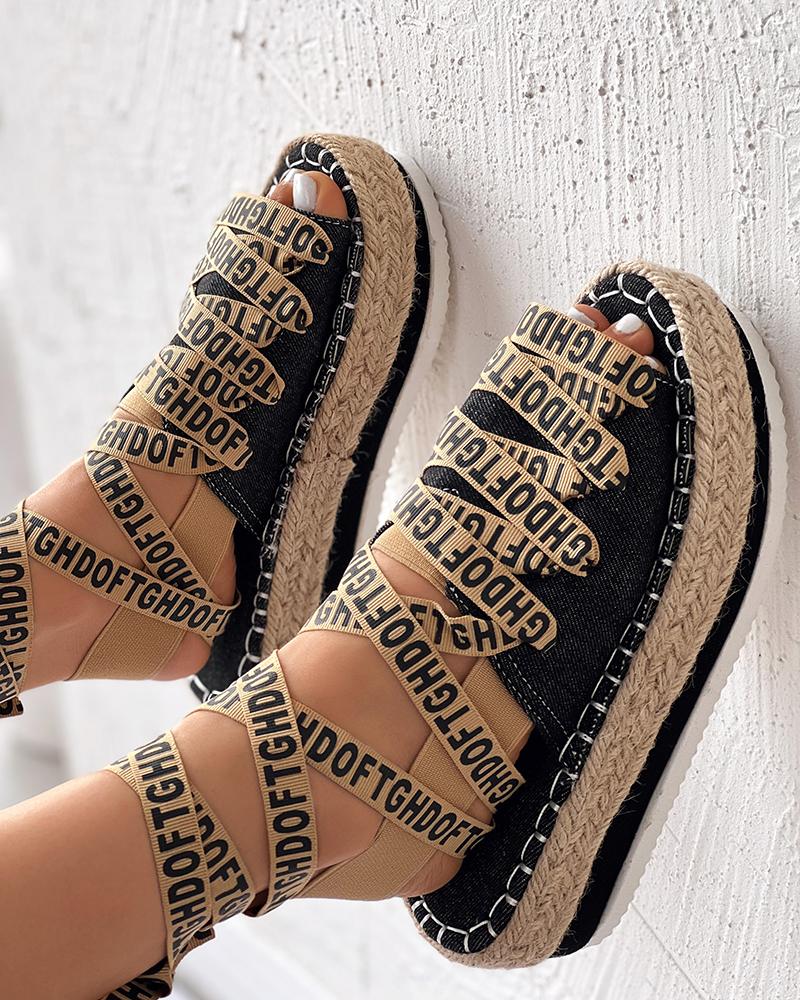 Letter Band Lace-up Platform Peep Toe Strappy Sandals