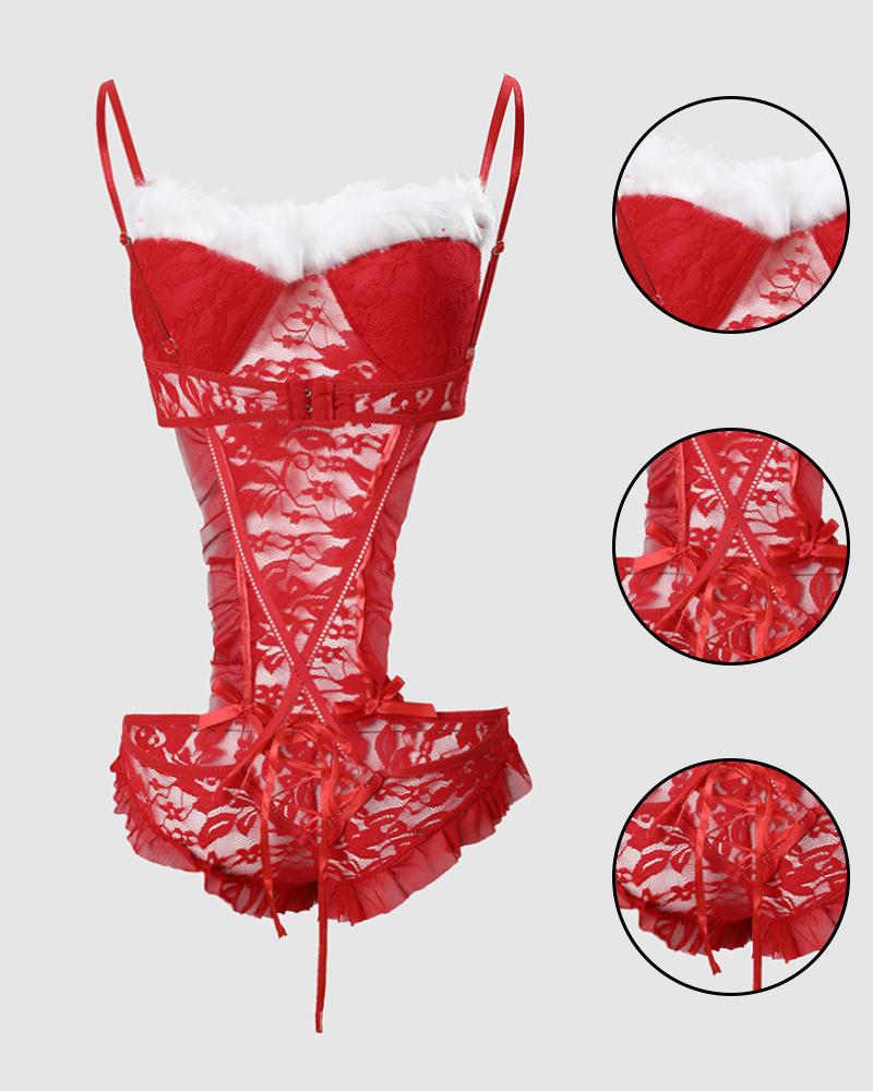 Christmas Lingerie Backless Bowknot Design Lace Fluffy Teddy