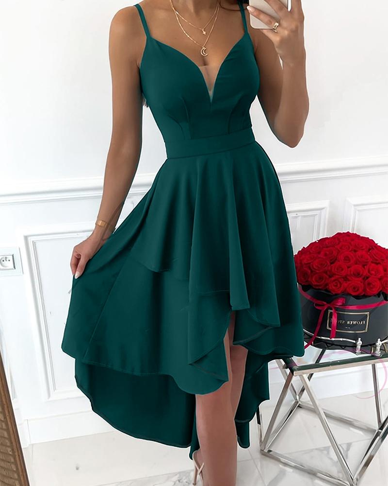 Style:Chic,Sexy Type:Asymmetrical Material:97%Polyester,3%Elastane Neckline:V-Neck Sleeve Style:Spaghetti Strap Length:Midi Pattern Type:Plain Decoration:Sheer Mesh Fit Type:Regular With Belt:No Occasion:Party Package Include:1* Dress Fabric Elasticity:High Stretch