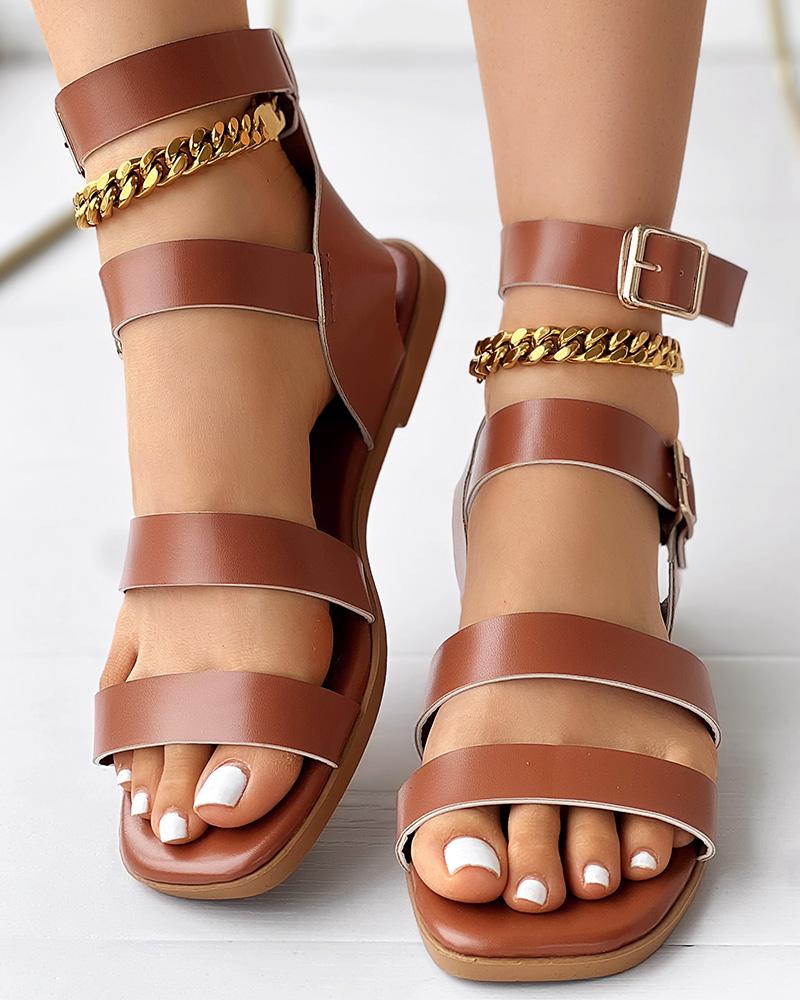 Style:Chic Type:Flat Sandals Material:PU Pattern Type:Plain Occasion:Daily Toe:Open Toe,Square Toe Heel Height:Flat Package Include:1*Sandals Strap Type:Ankle-strap
