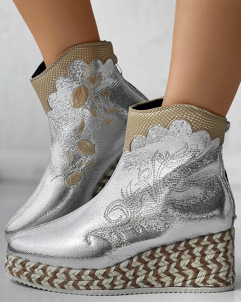 Metallic Floral Embroidery Sequin Espadrilles Platform Wedge Ankle Boots
