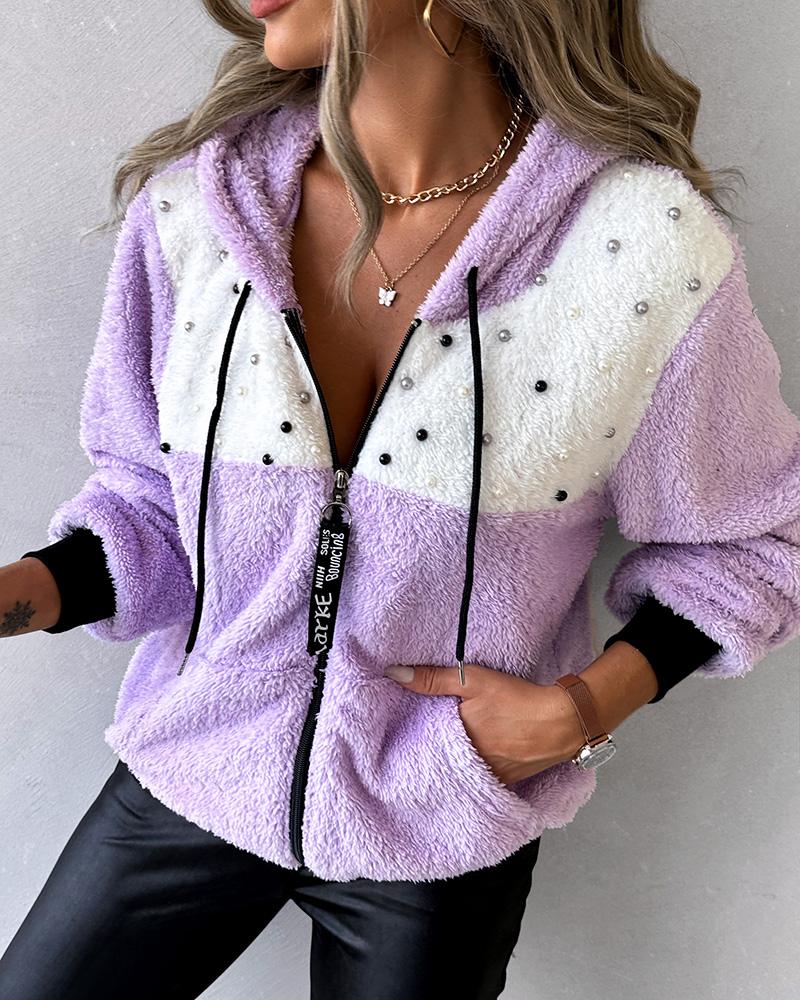 Colorblock Zipper Design Random Beaded Hooded Coat