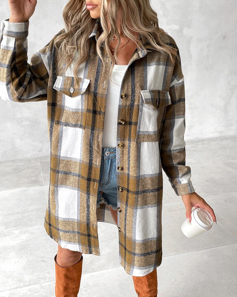 Plaid Print Pocket Design Buttoned Longline Shacket