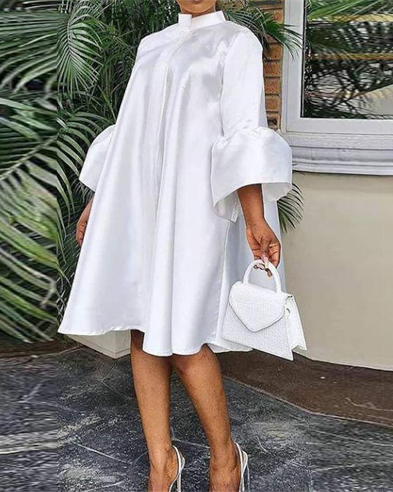 Style:Casual Type:Shirt Material:100%Polyester Neckline:Stand Collar Sleeve Style:Bell Sleeve,Three Quarters Length:Knee-Length Pattern Type:Plain Decoration:Ruffles Fit Type:Oversized Occasion:Daily Package Include:1* Dress Fabric Elasticity:Non-Stretch Sheer:No Care Instructions:Machine wash or professional dry clean