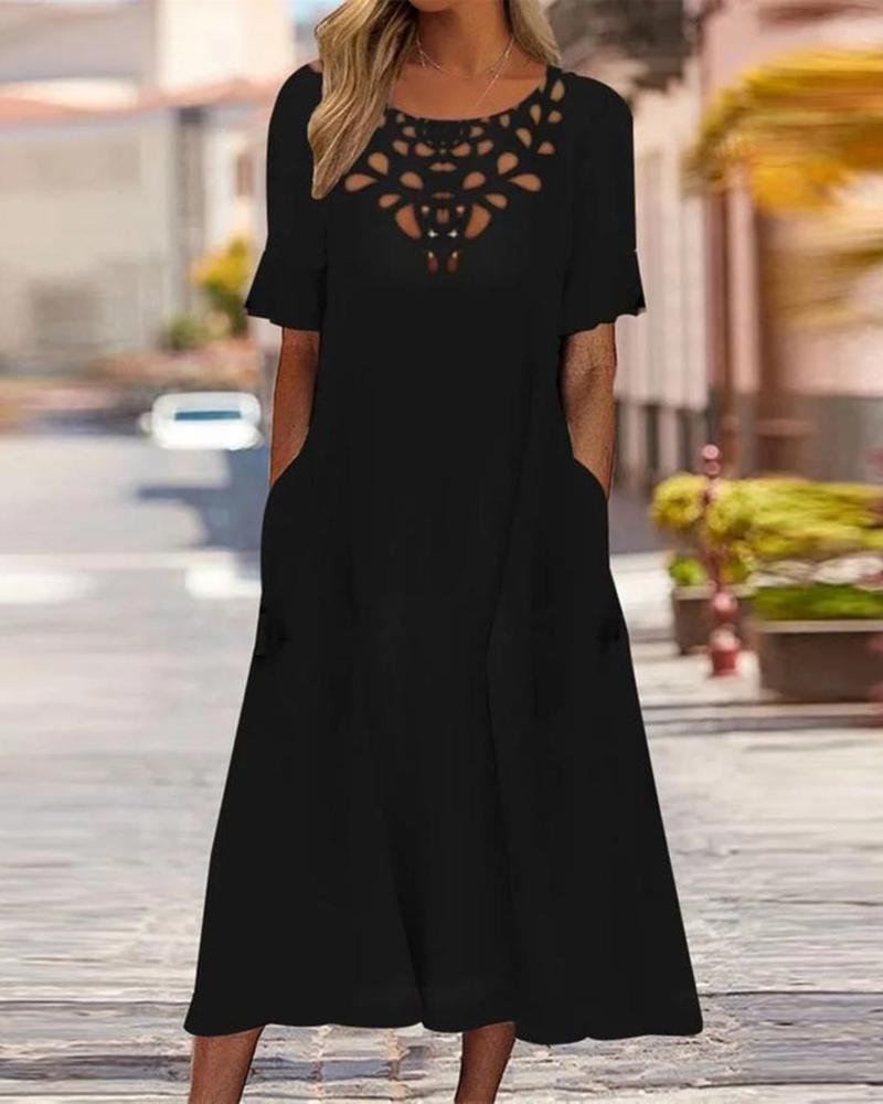 Style:Casual Type:Straight Material:97%Polyester,3%Spandex Neckline:Round Neck Sleeve Style:Short Sleeve Length:Mid-Calf Pattern Type:Plain Decoration:Hollow-out Fit Type:Regular Occasion:Daily Package Include:1* Dress
