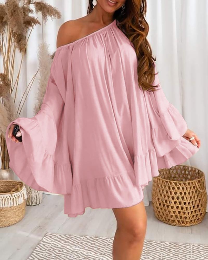 Style:Casual,Sweet Type:Smock Material:100%Polyester Neckline:Slash Neck Sleeve Style:Bell Sleeve,Long Sleeve Length:Mini Pattern Type:Plain Decoration:Bell Sleeve,Ruffles Fit Type:Regular Occasion:Daily Package Include:1* Dress