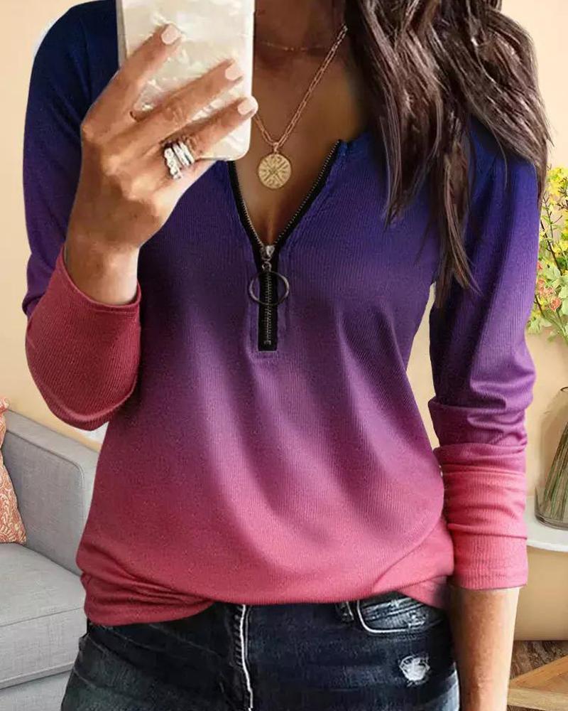 Ombre Zip Front Long Sleeve Top